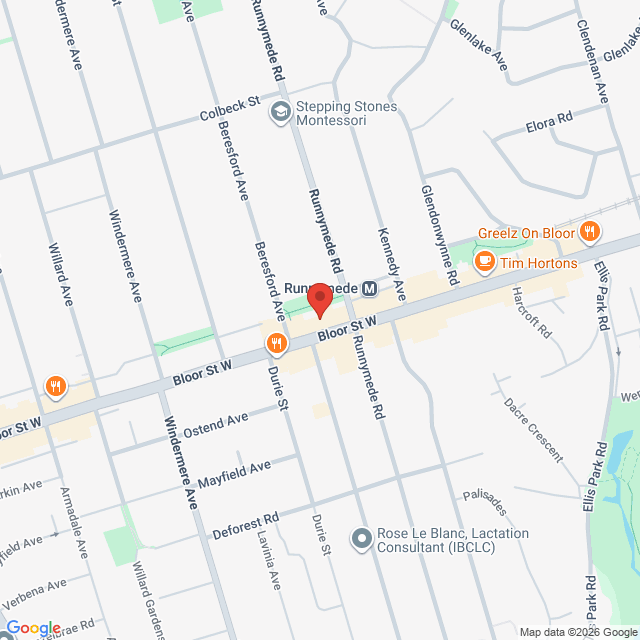 This office is on the second floor with stairs only access. It is a short walk from Runnymede Subway Station on the Bloor West Subway line. There is a Green P public parking lot, just half a block west from our office. It is just north of Bloor St. W. Turn north on Beresford Ave. to park, then walk east half a block to our office (towards Runnymede Rd.)